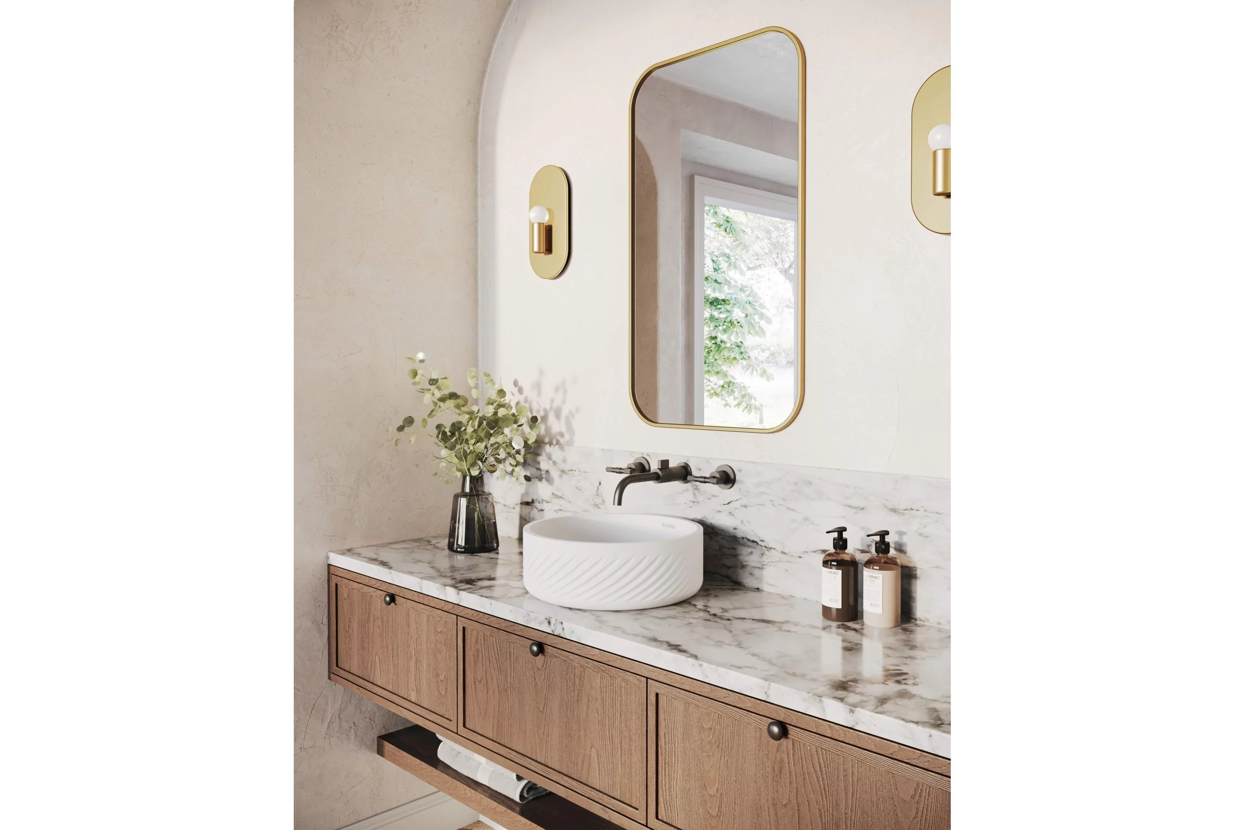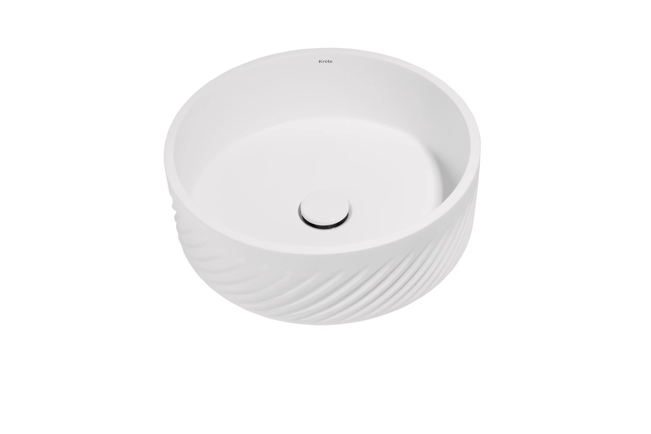 Margarites features a deeply fluted exterior and symmetrical form that adds architectural texture without overwhelming. Designed for countertop installation, it includes a colour-matched 1.25″ waste kit and comes in six refined shades. At 380 mm wide, it balances form and function.