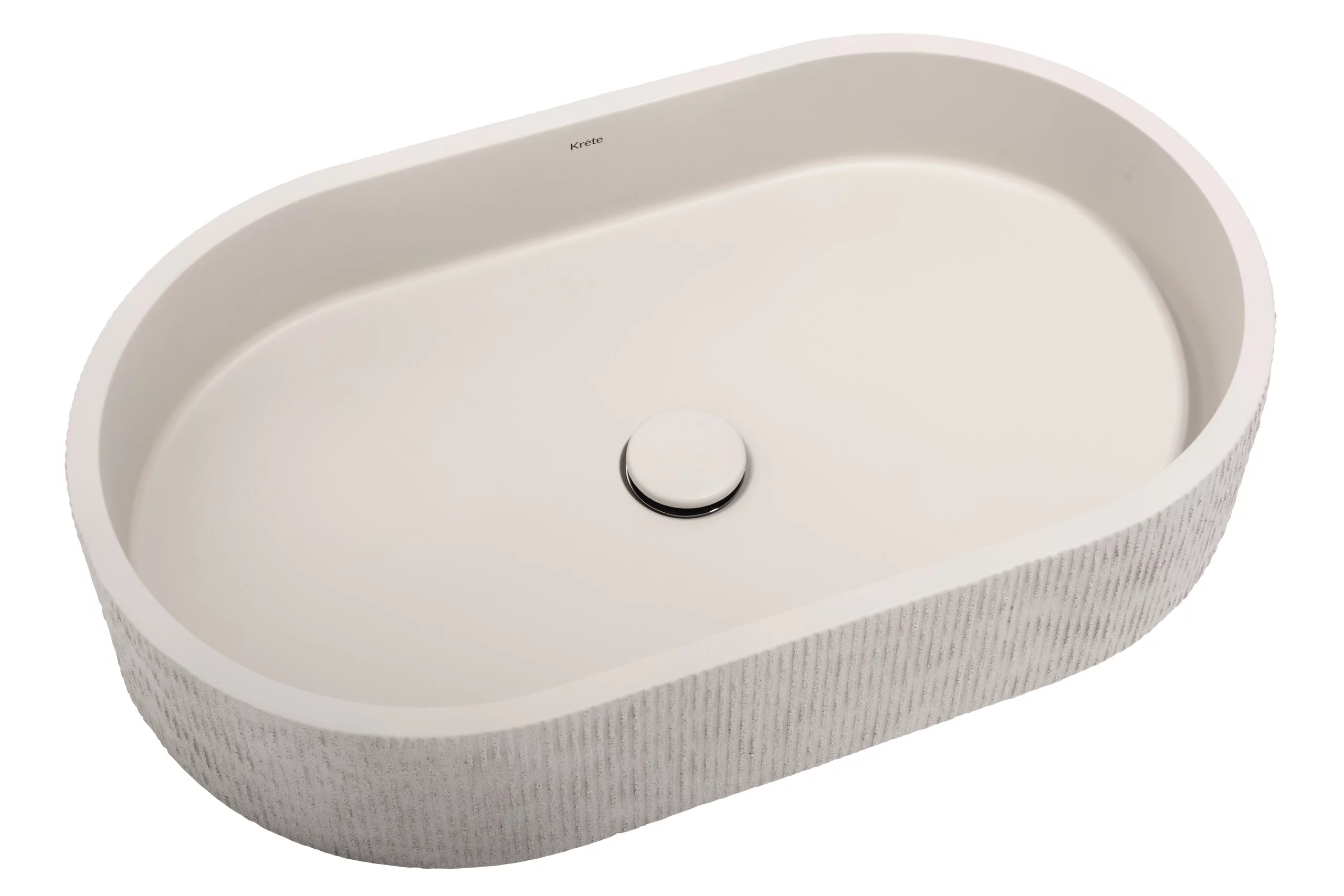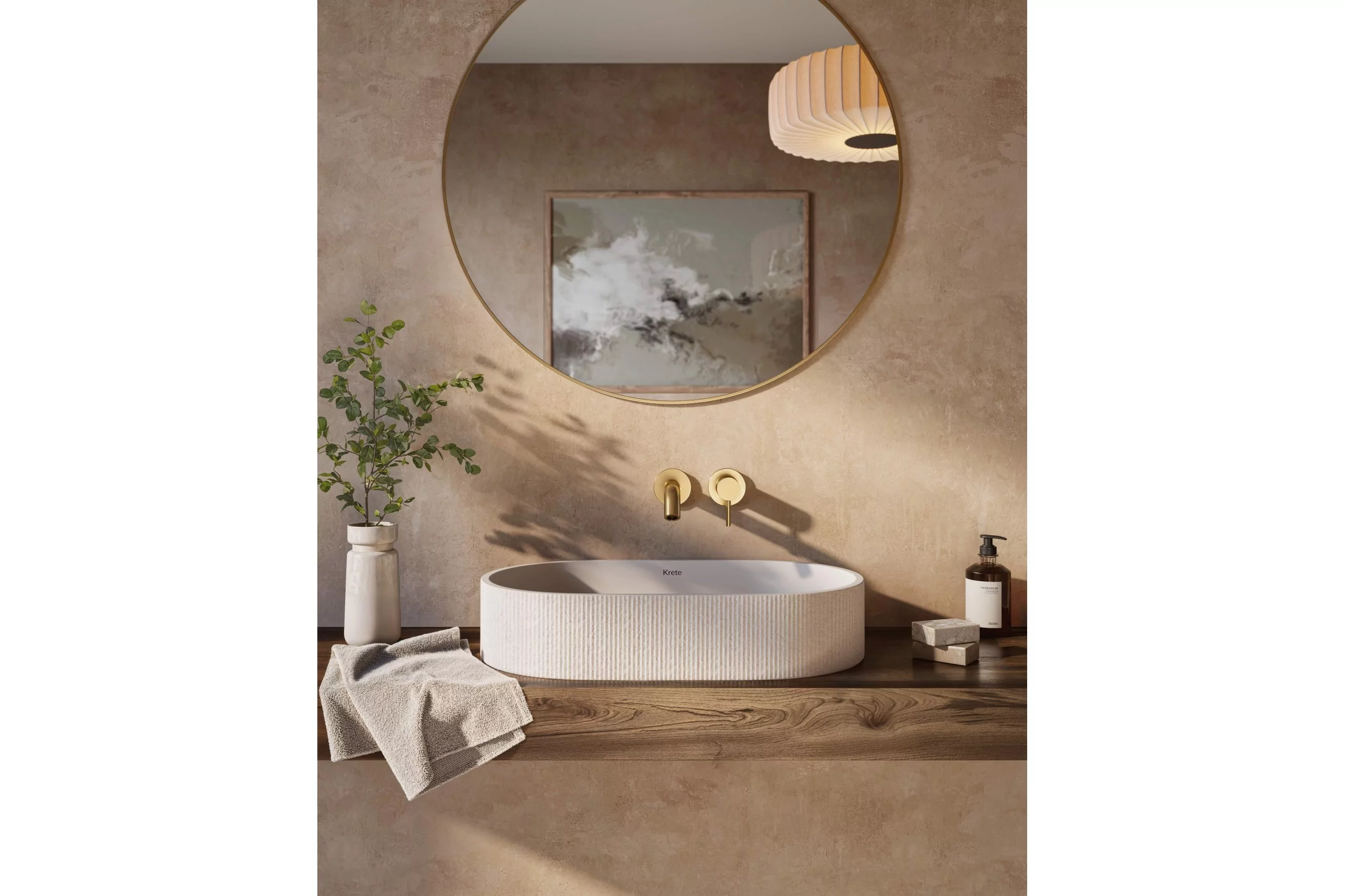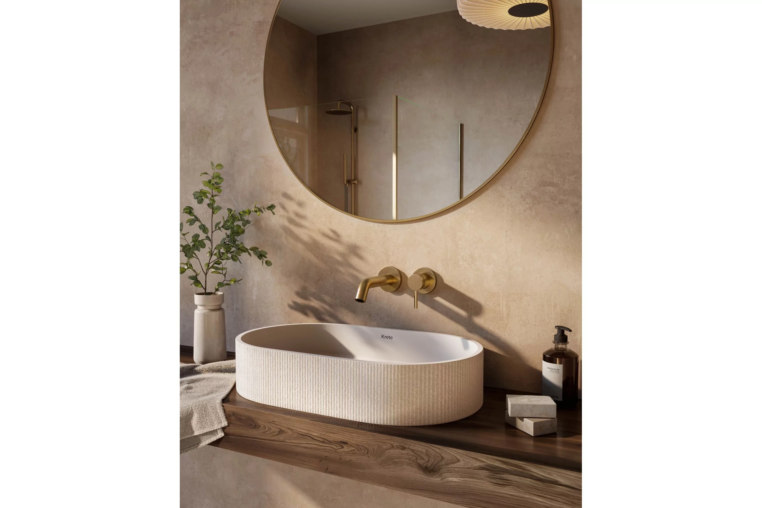 Marathi softens architectural form with smooth curves and bark-textured detailing that shifts with light. At 606 mm wide, its generous bowl and surface-mounted design with a colour-matched waste kit make it a versatile choice for calm, balanced interiors.